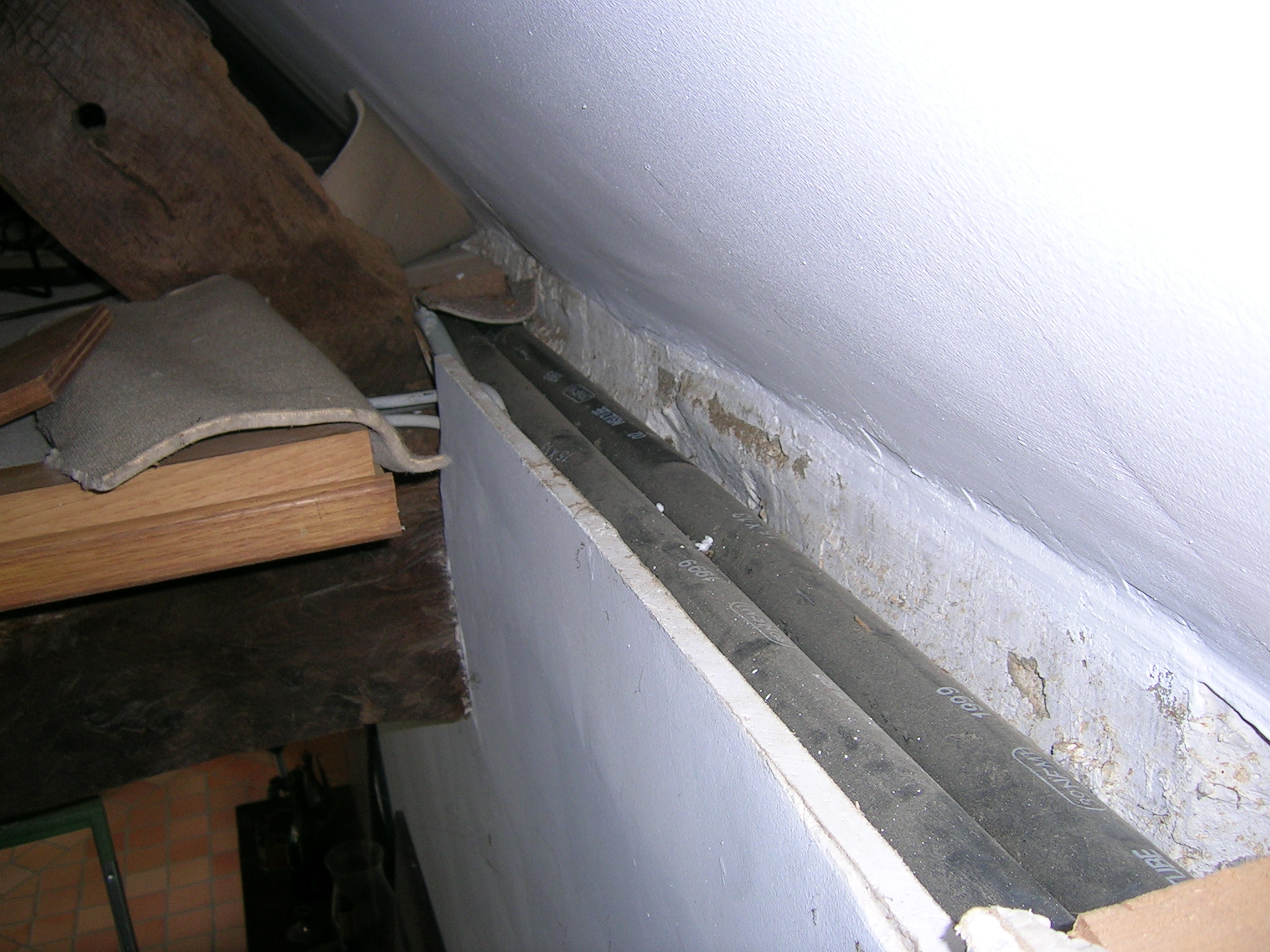 Maintenant, il faut faire la même chose pour la corniche de passage des câbles de l'escalier. Ici, visible les tuyaux du chauffage.