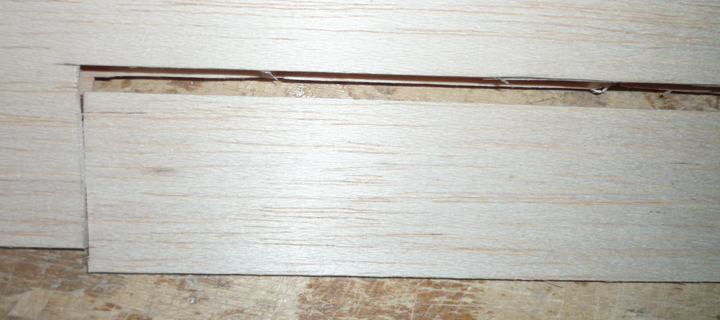 4 - Positionner le longeron intrados. Retailler légèrement les entailles dans les nervures pour les faire passer le longeron. Il ne doit pas être contraint pour prendre sa place. Coller.
