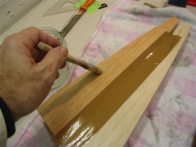 A ce stade, le plan fixe horizontal N'est PAS collé mais juste positionné en place aprés un contrôle : de son horizontalité vu en coupe (en fait, de son parallélisme à l'aile) de son bon positionnement perpendiculaire au fuselage vu en plan (Vieux truc connu : on prend un fil noué au bout d'une épingle piquée à l'avant du fuselage, sur sa ligne médiane, et on vérifie que la distance à l'extrémité du bord de fuite de l'empennage est la même des deux côtés).