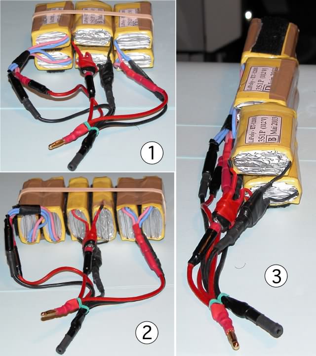 Photo 2 - Le pack 3S2P formé du regroupement, à l'aide des adaptateurs des deux 3S1P. Plusieurs dispositions sont possibles... ![]() Imax : 14/16 A - Capacité : 2400 mA Masse : 168 gr 1 - Dimensions (environ) : 65 X 45 X 40 mm 2 - Dimensions (environ) : 75 X 65 X 24 mm Les connexions sont sécurisées avec un morceau de ruban adhésif. |