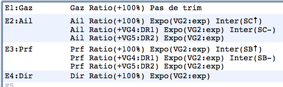 Et la profondeur et la dérive ? Vous appliquez la même logique expo et différentiel que pour les ailerons, avec à votre convenance un interrupteur unique pour tous, ou un interrupteur séparé pour chacun.