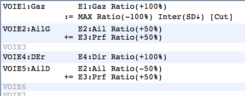 Voies5 le ratio est -100% l’inverse de la voies2, donc un aileron monte et l’autre descend.