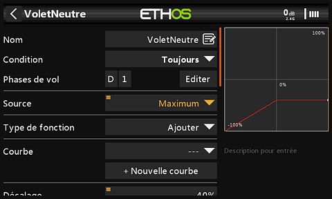 En final, après ajustement sur le planeur, j'ai décalage -40%, « Débattement bas » à 60%.