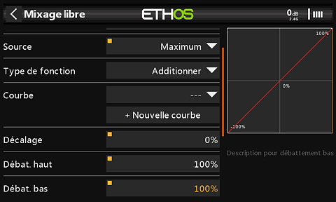 Mettez des valeurs faibles pour « Décalage » et « Débattement bas » pour ne pas risquer de bloquer vos servos.