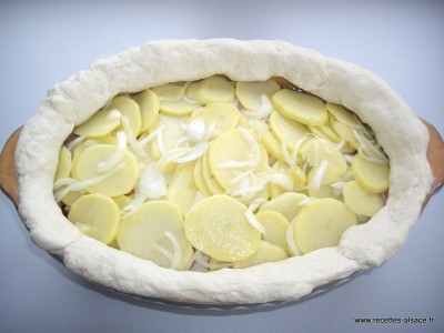 Au fond d’une terrine alsacienne à baeckeoffe, disposer 1/3 des pommes de terre et des oignons.